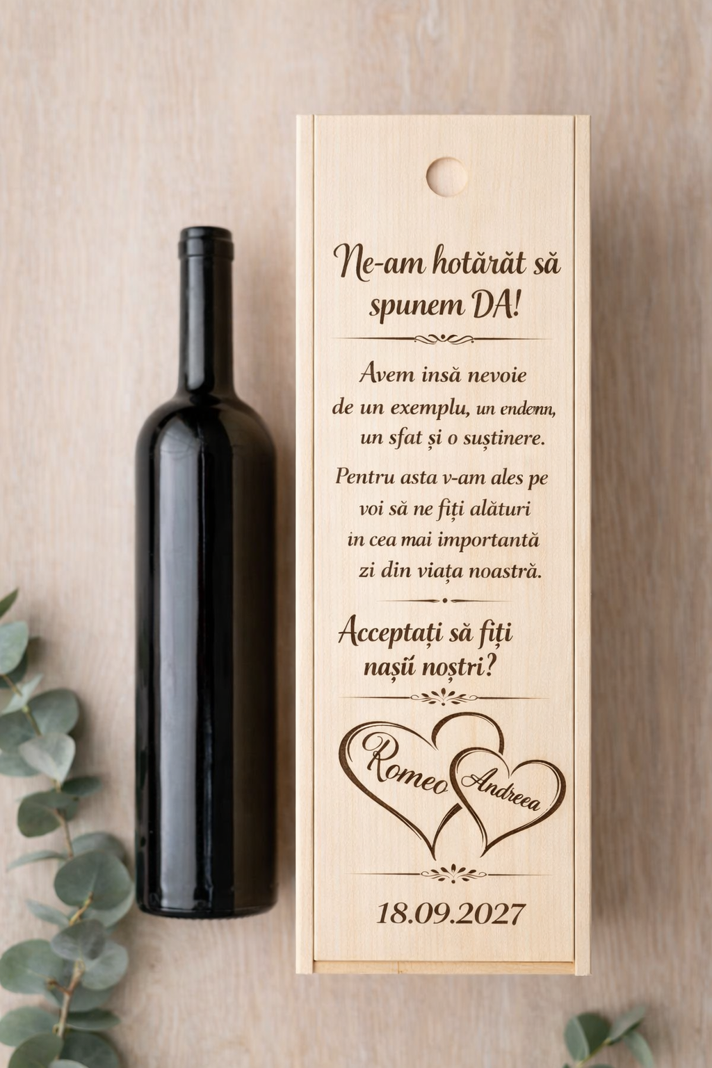 Transformă momentul cererii de nași într-o experiență de neuitat cu această cutie de vin personalizată, care încorporează stil, eleganță și sentimente sincere.