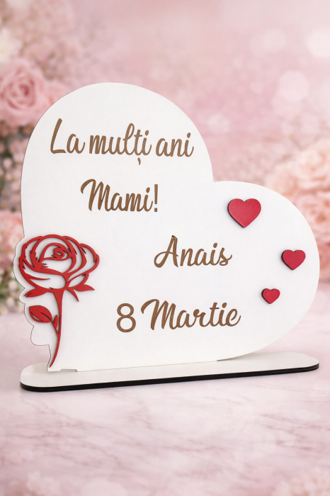 Placheta cadou personalizată este un cadou ideal pentru Ziua Mamei, aniversări sau alte ocazii speciale, simbolizând iubirea și recunoștința. Cu dimensiuni de 24 x 24 cm, are un design elegant în formă de inimă, decorat cu un trandafir stilizat și inimioare roșii în relief. Mesajul poate fi personalizat complet, permițând transmiterea exactă a sentimentelor dorite.