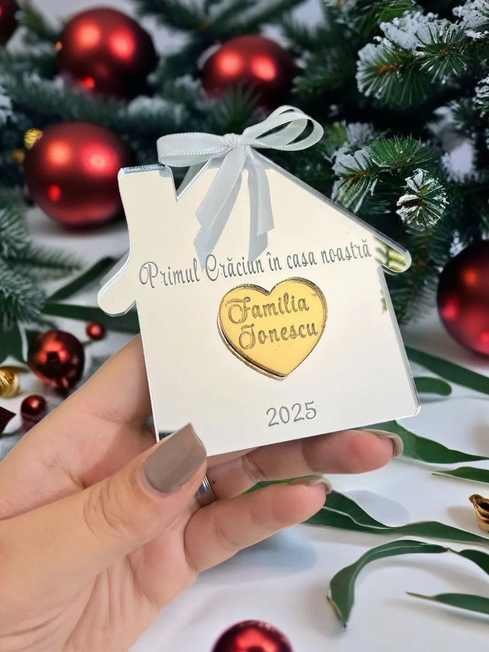 Adaugă un strop de magie bradului vostru cu un glob personalizat din plexiglas oglindă aurie sau argintie, creat special pentru a celebra acest moment unic! 🏠❤️