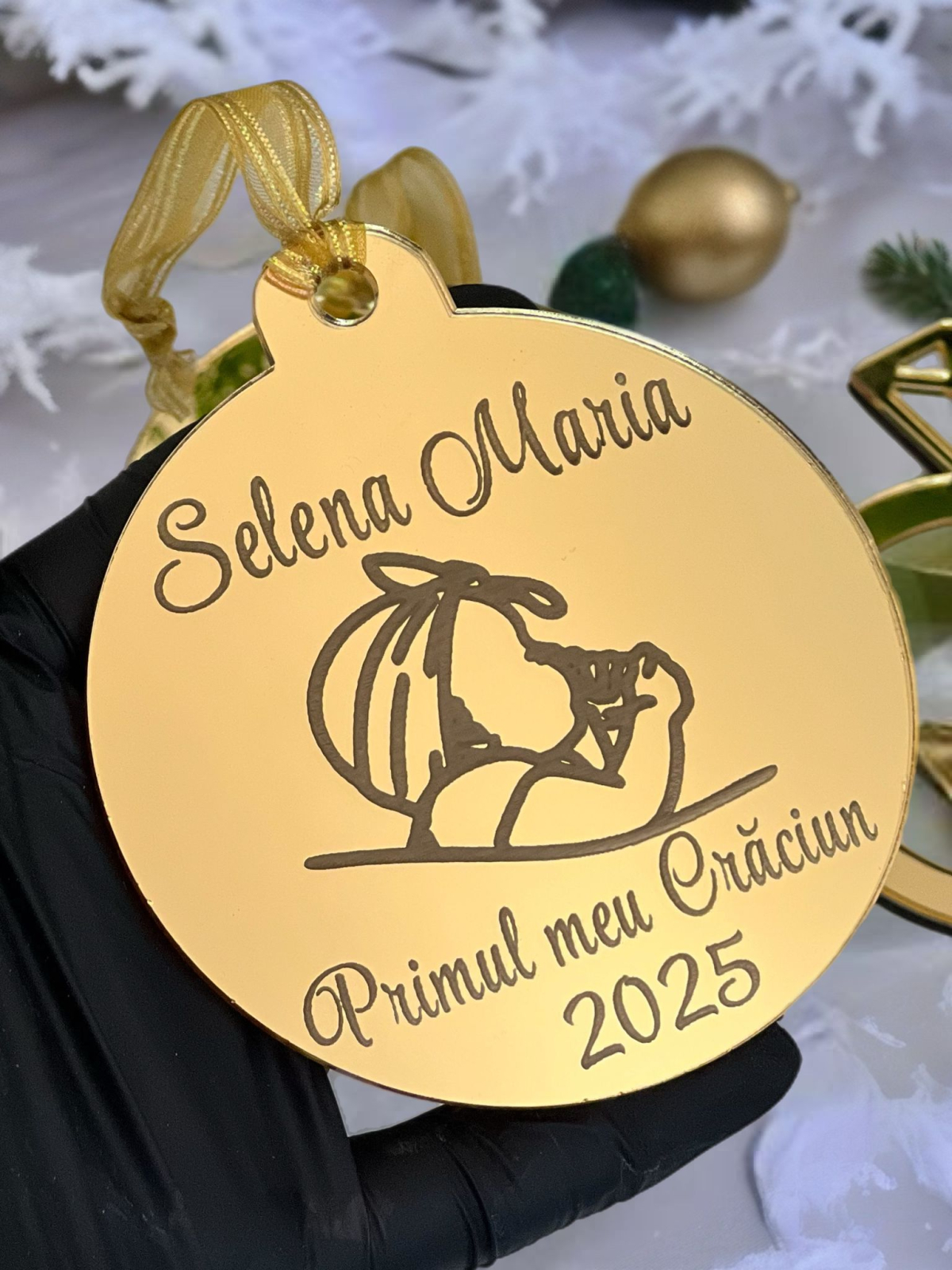 Faceți primul Crăciun al micuțului cu adevărat magic! Acest glob personalizat din plexiglass oglindă, cu diametru 10 cm și gravat cu mesajul „Primul Meu Crăciun”, adaugă un strop de eleganță și emoție în bradul vostru. Disponibil în aur și argint, este cadoul perfect pentru părinți, bunici sau pentru a păstra o amintire de neuitat.