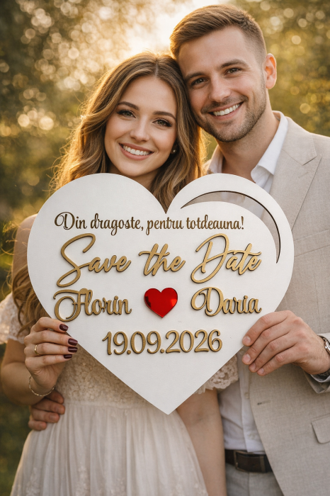 Panou „Save the Date” personalizat, creat pentru cuplurile care vor să anunțe ziua nunții într-un mod elegant și clar. Forma de inimă și textul 3D oferă volum și impact vizual, iar inima din plexiglass roșu oglindă adaugă un accent puternic în centru.