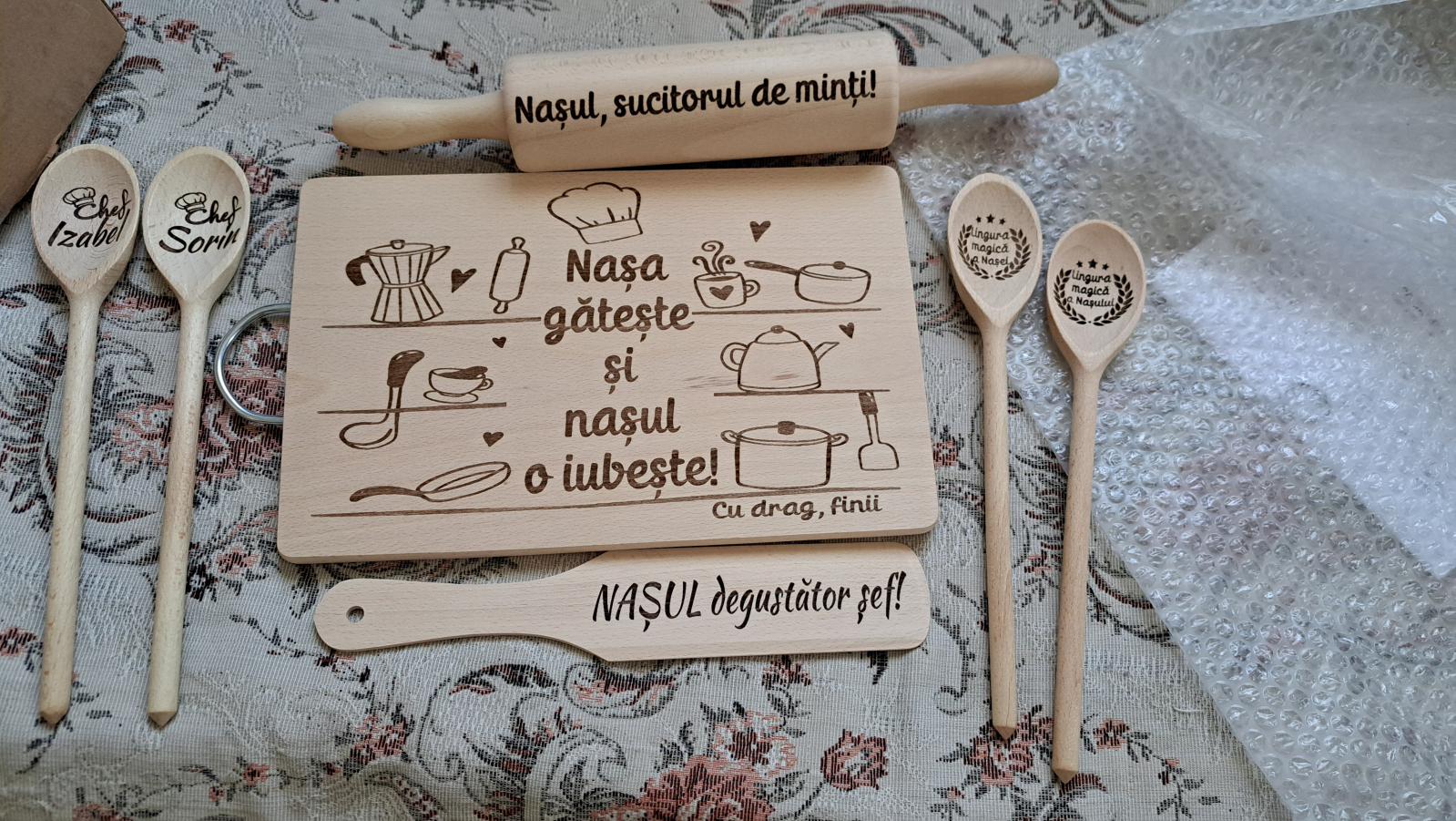 Setul include un tocător din lemn de fag (33x21 cm), un sucitor (39 cm), o spatulă (30 cm) și linguri din lemn (30 cm), toate gravate laser cu mesaje amuzante pentru nași.